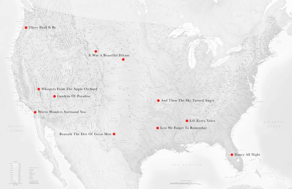 The artist has completed ten chapters of works belonging to Somewhere Out There, Something is Happening and continues to travel to proliferate the series. This nuanced body of work includes scenes from sites the artist encountered in such settings as the carbon landscape of the Permian Basin, remains of Manzanar War Relocation Camp for Japanese-Americans during World War II, the rolling hills of Wounded Knee in Badlands, memorials for the victims of the Pulse Nightclub shooting, Orlando, and the forest of Philadelphia (MS) where three Civil Rights champions met a tragic fate in 1964.