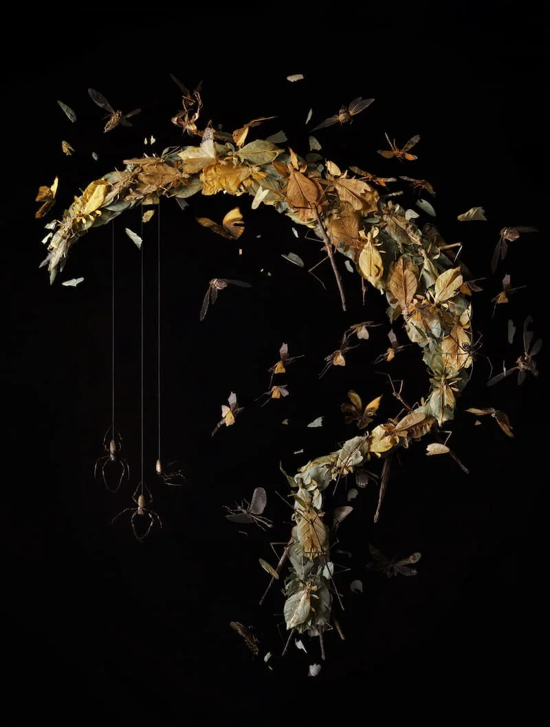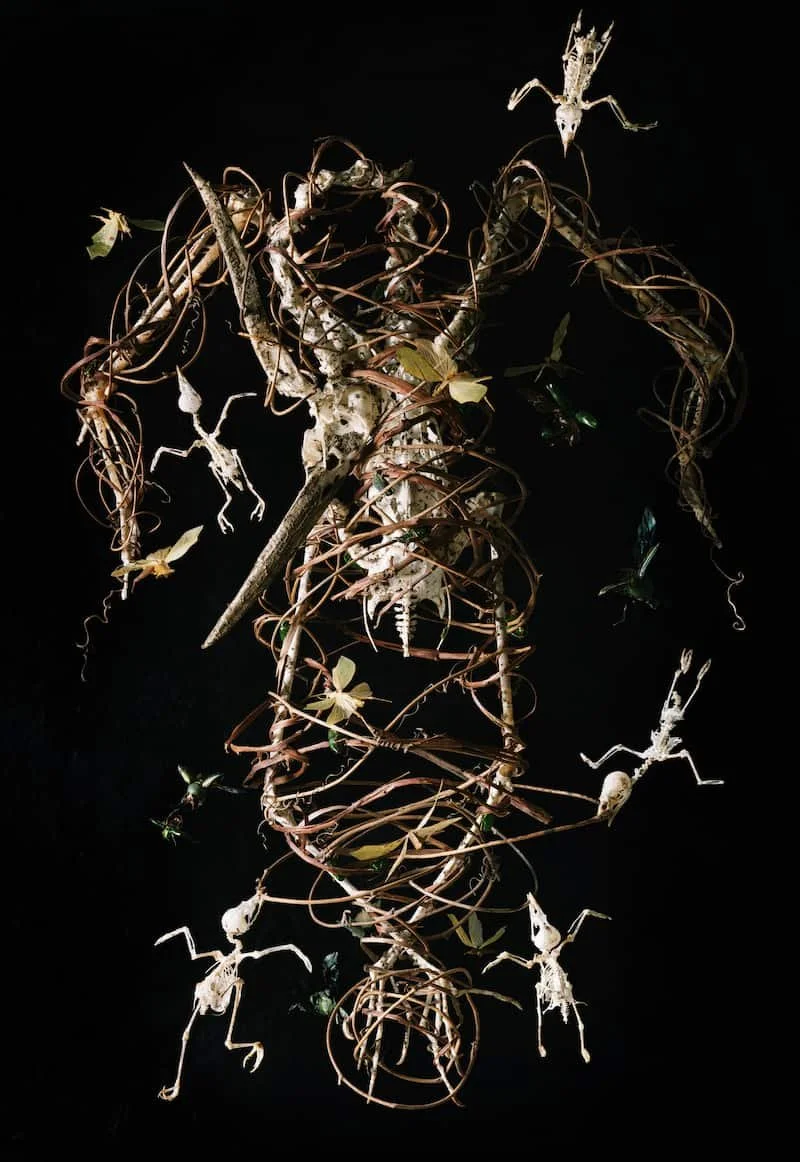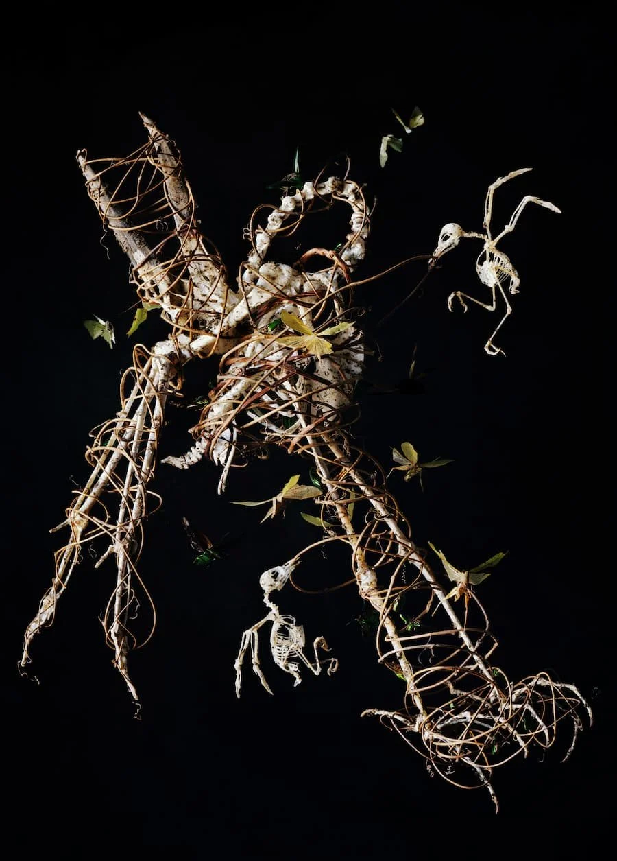 Two panels have recently been added to Tara Sellios’ evolving tableau of photographs belonging to the greater work, Ask Now the Beasts. Seasonality feels a critical aspect to this latest pair of images, completed 2023, that feature sheep skeletons. The symbols in these frames conjure connections to the shoulder seasons- spring and fall- moments when sacrifice once insured prosperity, but the offerings here seem to have withered on the vine. Light strikes from the left as if to indicate the passage of days grown too long. In Dimittis (feel free to let go in Latin) the sheep’s hooves hold a harp; it is showered by roses from dove skeletons flying above. What remains of the sheep in the second frame, Praeligo (to bind) seems to fall earthward- come apart in pieces anywhere it isn’t tangled in the dry vines of withered grapes that hold together an entangled spine.